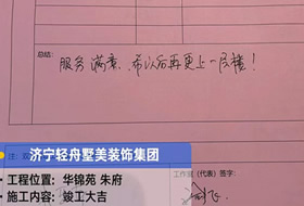 貴府的工程已全部圓滿竣工并通過了竣工驗收,感謝您在整個過程中對于我們的理解、支持和包容。輕舟美住裝飾張興魯工作室提前恭賀您和家人喬遷新居,恭祝您和家人生活幸福美滿、事業蒸蒸日上。